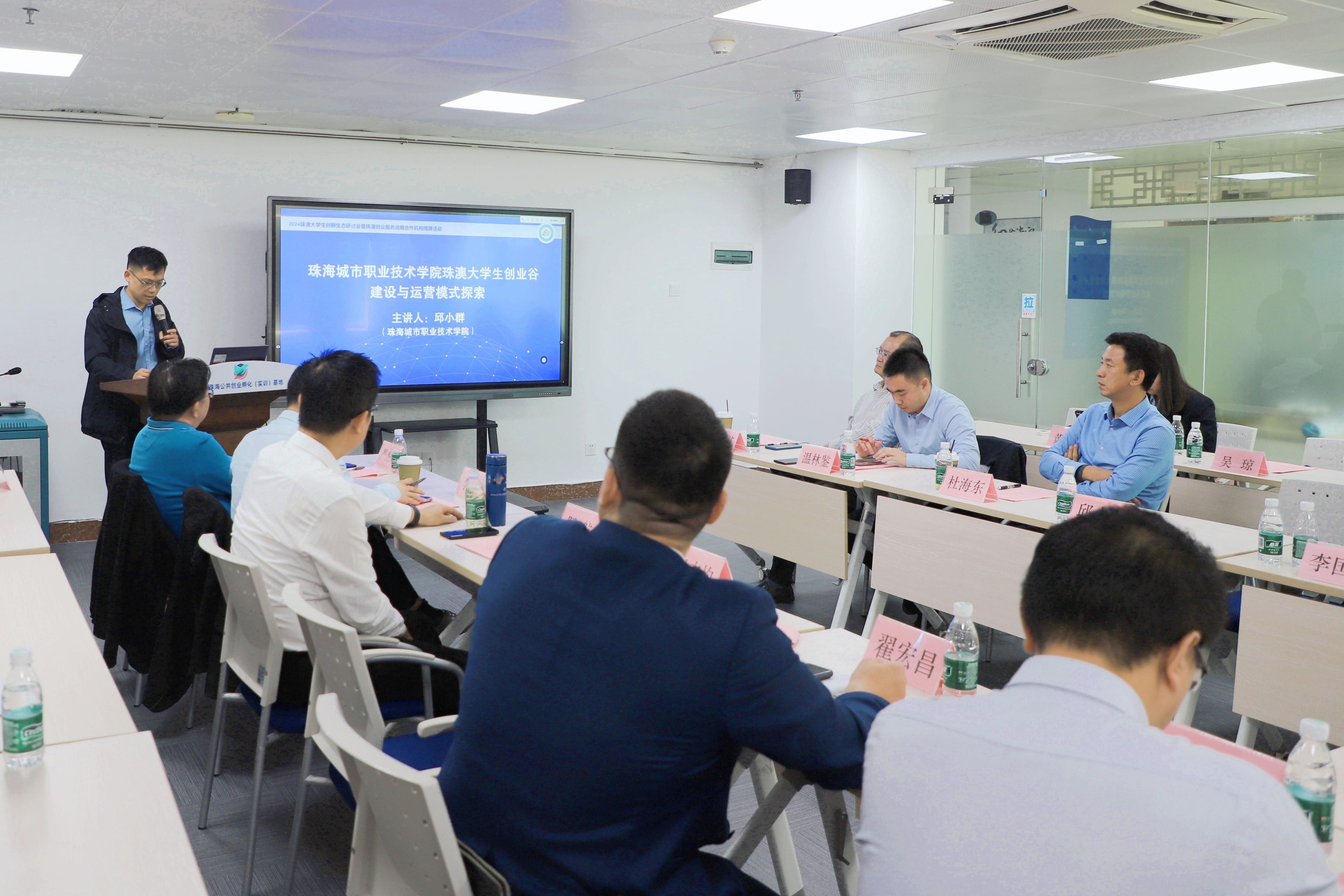 邱小群主任以《珠海城市职业技术学院珠澳大学生创业谷建设与运营模式探索》为题进行分享,他介绍今年学校筹建的珠澳大学生创业谷即将进入运营阶段,将以推进大学生创新实践投入社会发展,实现个人价值作为主要导向,希望更多的港澳青年能够了解珠澳大学生创业谷,一起“造梦”。